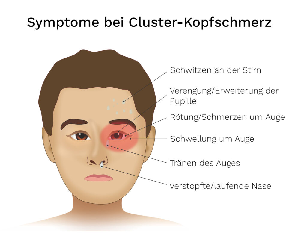 Die Begleiter des Cluster-Kopfschmerzes sind sichtbare Veränderungen im Gesicht auf der betroffenen Seite während der Kopfschmerzen – das kann eine Rötung, Schwellung oder ein Tränen des Auges sein, aber auch ein Rinnen oder verstopftes Gefühl in der Nase, Verengung oder Erweiterung der Pupille oder eine Schwellung oder vermehrtes Schwitzen auf der Stirn sind möglich. Die Dauer einer Attacke ist bei 15 Minuten bis drei Stunden.